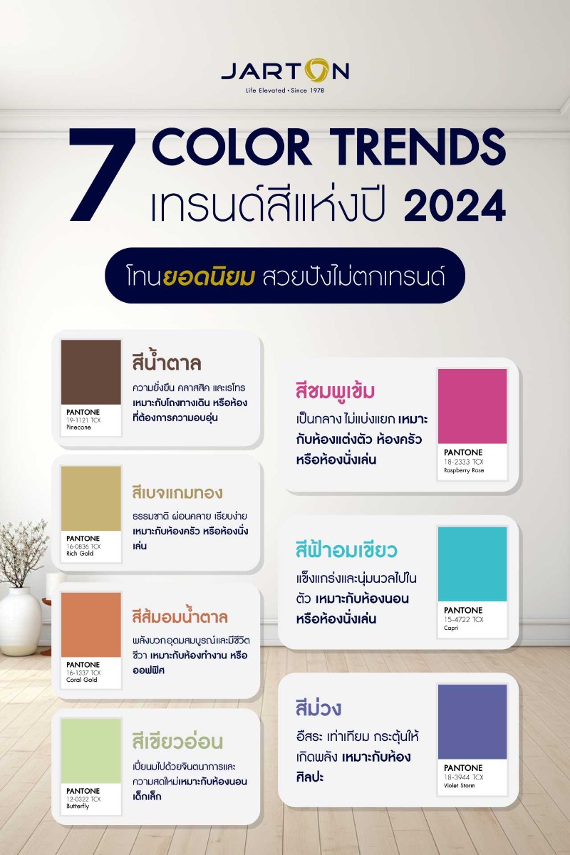 เรามาดูไปพร้อมกันเลยว่า 7 เทรนด์สีแห่งปี 2024 นั้นมีอะไรบ้าง แล้วแต่ละเฉดจะเหมาะสำหรับห้องแบบไหน